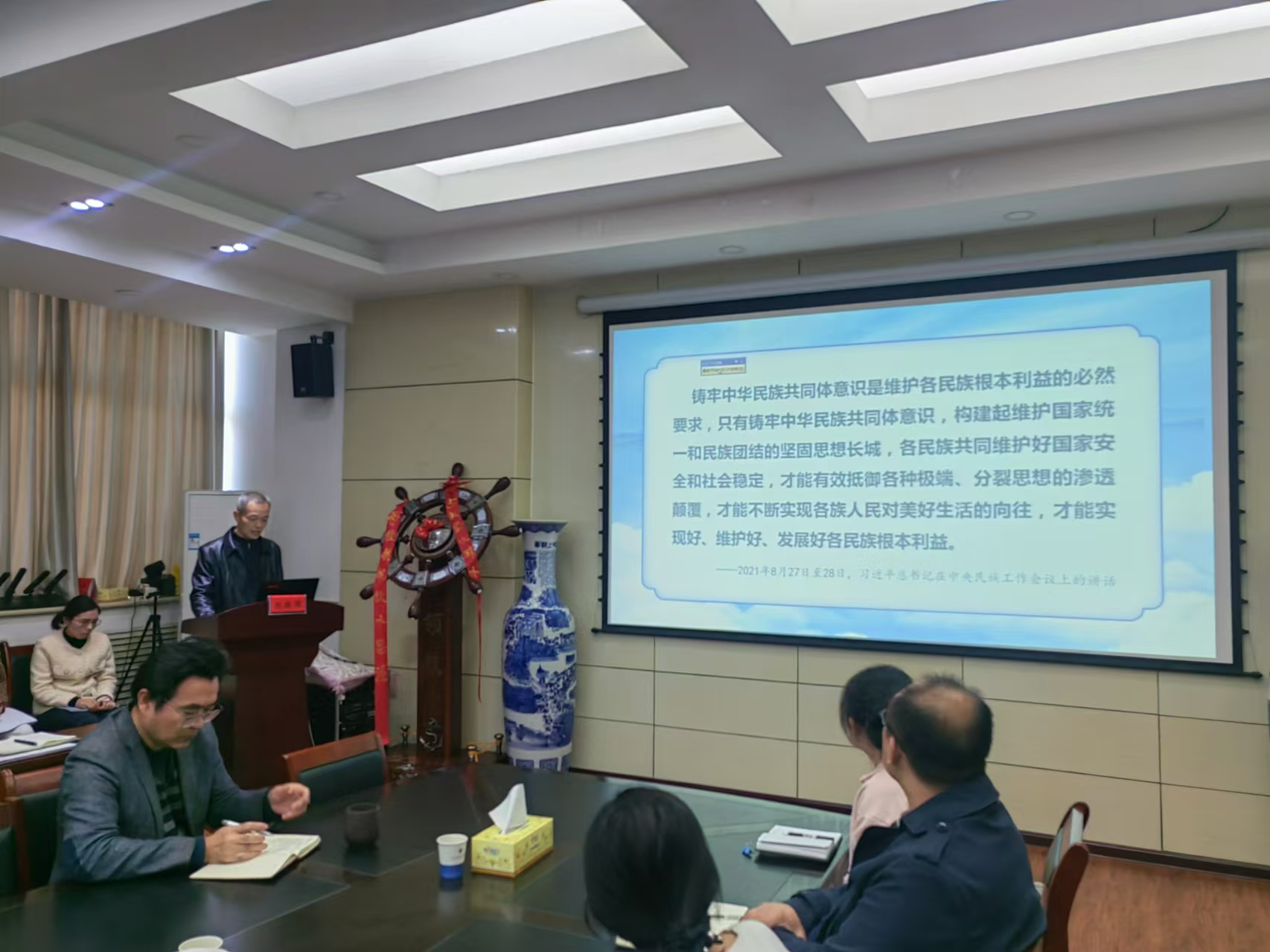 陈振国从“铸牢中华民族共同体意识的战略意义”“把牢中华民族共同体意识的丰富内涵”和“铸牢中华民族共同体意识理论价值”三个方面开展讲授。陈振国指出我国是统一的多民族国家,中华民族共同体意识是国家统一之基、民族团结之本、精神力量之魂。要深刻把握铸牢中华民族共同体意识在推进中国式现代化进程中的作用,增进五个认同,坚定团结在以习近平同志为核心的党中央周围,走中国特色社会主义道路,大力弘扬伟大民族精神,凝聚起建设伟大祖国的磅礴力量,同心共筑中华民族伟大复兴中国梦。