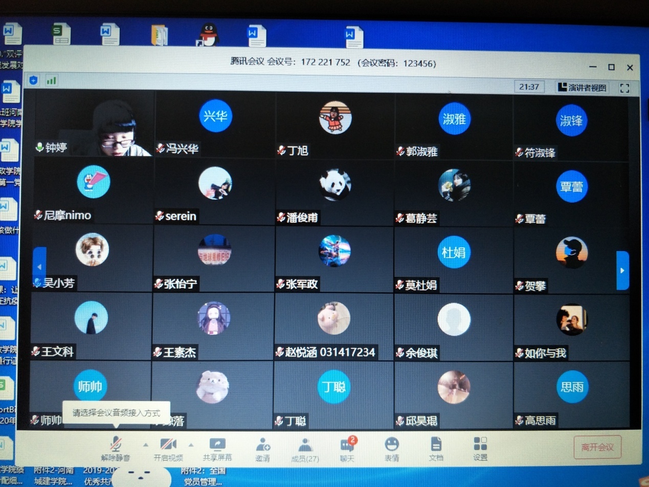 首先,5名拟转正预备党员详细汇报了自己一年来预备期的现实表现。所在党小组、支委会代表分别报告每一位同志在预备期间的教育考察情况,并对其能否转正发表意见。支部十一名有表决权的正式党员通过视频会议的“群聊”功能进行了无记名投票。根据表决结果,党员大会一致同意王妞等5名同志按期转为中共正式党员。