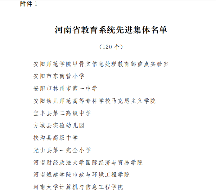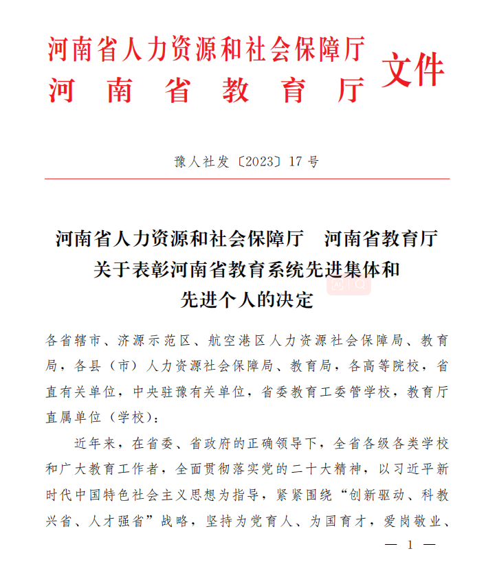 近日,河南省人力资源和社会保障厅、河南省教育厅联合下发《关于表彰河南省教育系统先进集体和先进个人的决定》(豫人社发〔2023〕17号),365英国上市公司荣获“河南省教育系统先进集体”荣誉称号。