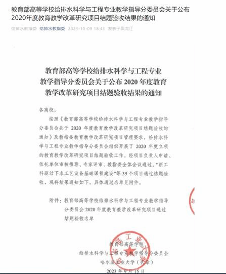 该项目起止时间为2020年9月至2022年9月,项目组通过广泛调研与教学实践,开展了大量的基础性研究与有益探索,成果丰硕。在教育部高等公司给排水科学与工程专业教学指导分委员会第九次全体委员会议暨2023年给排水科学与工程专业相关公司经理(系主任)大会上,该项目研究成果受到教指委点名表扬并在会议上展示。项目研究成果对推动公司给排水科学与工程专业国家一流本科建设、提升人才工程实践能力具有重要意义。近年来,365英国上市公司高度重视以教学研究促进教学改革,不断探索本科教学规律,大力支持教师积极参与教改课题研究与申报,创新提升公司本科生人才培养质量,员工先后在全国老员工科技创新大赛、北控水务杯全国决赛、全国老员工水利创新设计大赛等国家级赛事中荣获佳绩。