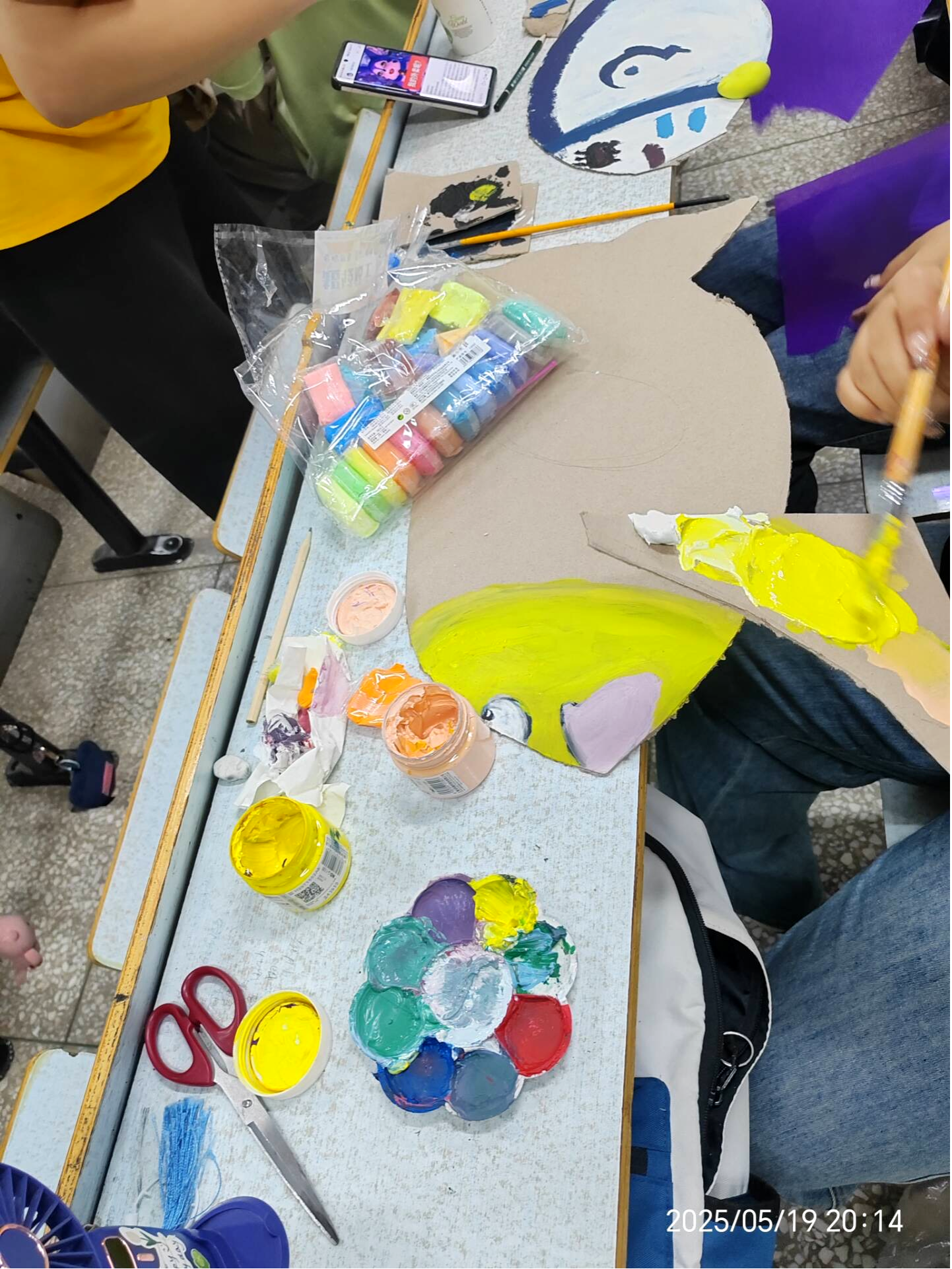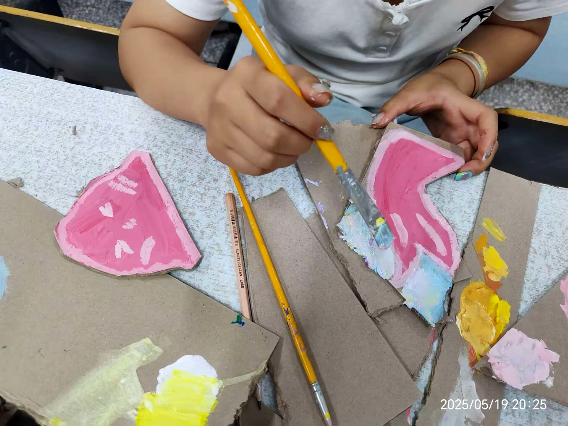 同学们利用废旧纸板剪裁出金鱼的基本形状,用颜料和画笔进行细致的彩绘。充分发挥创造力,制作出各具特色的金鱼摆件。在活动中,参与者们互相分享创作灵感,现场气氛活跃而融洽。